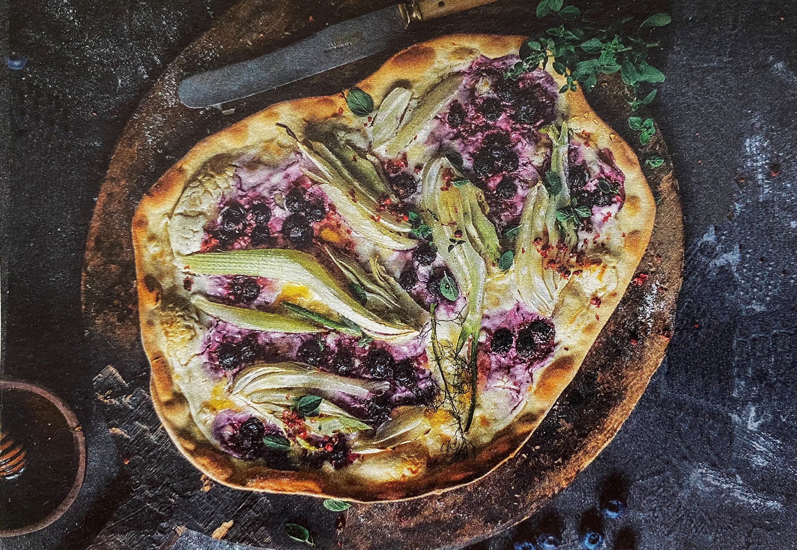 Backofen auf 250 ° Celsius (Umluft 220) vorheizen. Fenchel putzen, in mundgerechte stücke schneiden. Schmand mit 1 Prise Salz und Zitronensaft verrühren. Teig auf einer bemehlten Arbeitsfläche zu 2 hauchdünnen Fladen ausrollen. Auf ein Backblech mit backpapier legen. Mit Schmand bestreichen. Fenchel und Heidelbeeren daruf verteilen. Flammkuchen 10-12 Minuten auf unterster Schiene backen. Mit rosa Pfeffer, Oregano und Honig würzen und sofort servieren.